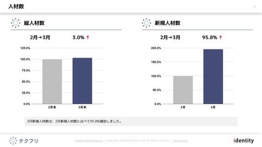 3月新規人材数は、2月新規人材数と比べて95.8%増加しました。