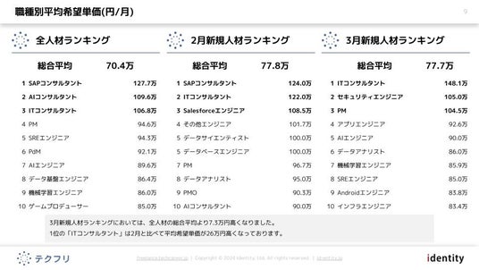 3月新規人材ランキングにおいては、全人材の総合平均より7.3万円高くなりました。