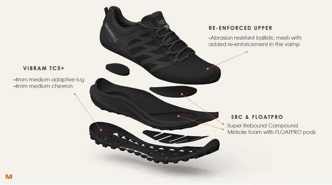 当製品の最大の特徴は、耐摩耗性に優れたバリスティックメッシュを採用したアッパー構造です。ハードな環境での活用を想定したTACTICALシリーズだからこそ、安心感のあるパフォーマンスを発揮します。また、ミッドソールは、反発弾性に優れたSRC(スーパーリバウンドコンパウンド)ミッドソールで全体を構成し、前足部と後足部にはメレル独自の超軽量且つクッション性にすぐれた「FLOATPRO™」ポッドをアディショナルパーツとして採用。優れたクッション性と安定性に加え、従来以上の歩行推進力を提供します。そして、アウトソールにはMERRELL専用のVibramアウトソール「Vibram TC5+」を敷設。TACTICALのタフさとトレイルランニングの柔軟さを両立させた新時代の「MERRELL TACTICAL」となっています。