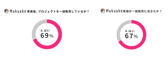 また、「Makuake」実施が一般販売に活きたかという質問にも67%が「はい」と答えており、一般販売前に「Makuake」を活用することに有用性を感じていることも分かりました。