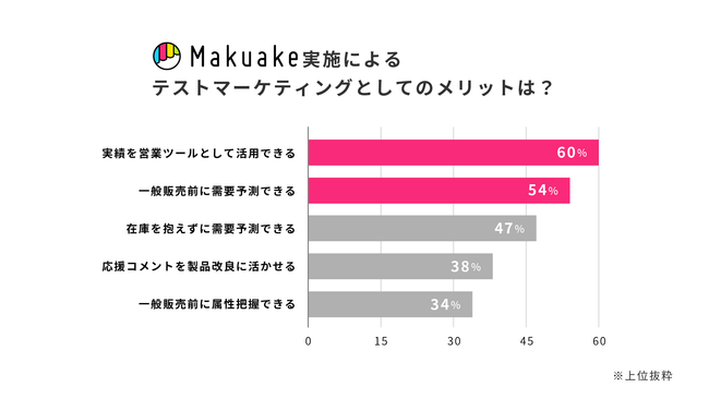 テストマーケティング活用で得られるメリットの質問では、「実績を営業ツールとして活用できる」が60%と最も多くの回答が集まりました。一般販売をする前に「Makuake」上で実績を作ることができるため、サポーターに留まらず、問屋やセレクトショップのバイヤーなどからの注目度も高くなっていることから、「Makuake」での実績が販路拡大のための営業ツールとして活用できるという回答が多くありました。