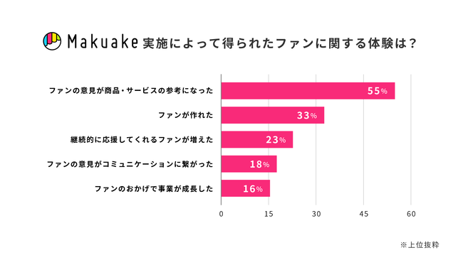 また同質問内で「商品や会社のことを深く知っていただけた」が37%と最も回答が多く、プロジェクトページで実施に至る背景や想いを伝えられることにメリットを感じていることが分かるとともに、ファンづくりに関する質問でも「サポーター(ファン)の意見が商品・サービスの参考になった」の次に、「ファンが作れた」や「継続的に応援してくれるファンが増えた」が続き、ファンを獲得する場としてもメリットを感じていることが分かりました。