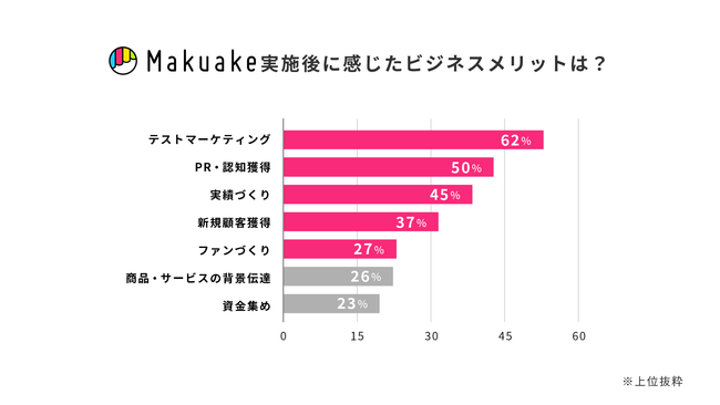 クラウドファンディングにおいて想起されやすい事業者側のメリットとして、「資金調達」が挙げられますが、「Makuake」実行者において「資金集め」の回答は23%ほどで、「テストマーケティング」が62%と3倍弱の回答となりました。続いて「PR・認知獲得」が50%、「実績づくり」が45%、さらに「新規顧客獲得」が37%と、「資金集め」以上にそのほかのビジネスメリットを感じている実行者が多いことが分かりました。実行者が様々な狙いを持って、「Makuake」上でプロジェクトを実施していることが分かります。