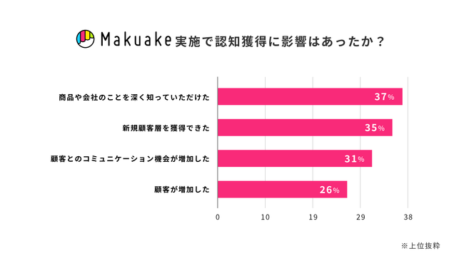 認知獲得に関する質問では、「新規顧客層を獲得できた」が35%、「顧客が増加した」が26%と、プラットフォーム自体に様々な属性のサポーターが多く訪れているため※、プロジェクトの掲載がこれまでリーチすることのできなかった新規顧客層の獲得や増加に繋がり、メリットを感じていることが分かりました。