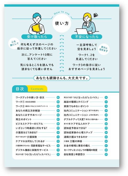 従業員の方々が手にとりやすく最低限、両立の準備に必要なアクションをとっていただけるようにするために、もらったその日から役に立つ!介護があっても自分らしく働くあなたの「仕事と介護の両立支援ハンドブック」を販売開始いたします。