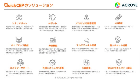 QuickCEPは次世代CRMとして、CDP、シナリオチャットボット、AIチャットボットをワンストップで提供しています。各種SNSやメールなどあらゆるコミュニケーションツールと連携したMA(マーケティングオートメーション)機能、顧客に合わせた質の高い接客、最適な商品レコメンドをリアルタイムで提供しています。