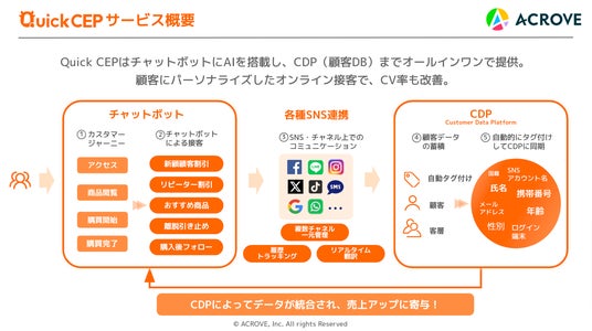 EC売上最大化を実現するコマーストランスフォーメーション事業(CX事業)とM&Aを通してブランド育成を図るECロールアップの2事業を展開する株式会社ACROVE(本社:東京都千代田区、代表取締役社長:荒井 俊亮、以下ACROVE)は、株式会社QuickCEP(本社:埼玉県さいたま市中央区、代表取締役社長:李 佳騏、以下QuickCEP)と日本における独占開発販売契約を締結したことをお知らせ致します。