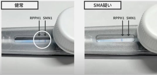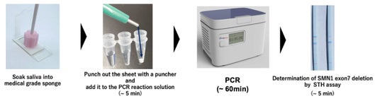 採取しただ液を試薬と混合し簡易的にDNAをPCR増幅した後、専用のスクリーニングキットに設置することで、1.5時間以内にその場でSMAのスクリーニングを実施できる検査