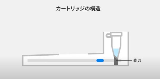 チューブをカートリッジ内に差し込むと、設置された剃刀がチューブに切れ込みを入れ、反応液がカートリッジ内に展開