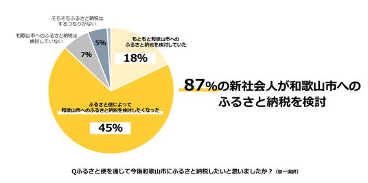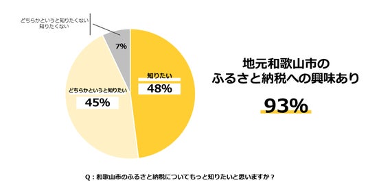 また、新社会人285名を対象に実施した「ふるさと納税に関するアンケート調査」では、48%が「和歌山市のふるさと納税制度についてもっと知りたい」、45%が「どちらかというと知りたい」と回答しており、和歌山市へのふるさと納税に対する関心が非常に高いことが分かりました。