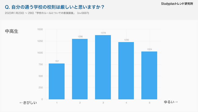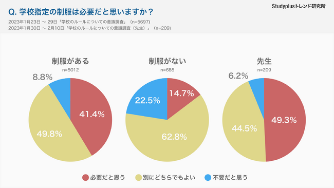 スタディプラス株式会社(本社:東京都千代田区、代表取締役:廣瀬高志、以下スタディプラス)のStudyplusトレンド研究所は、2023年1月23日(月)から1月29日(日)にかけて学習管理アプリ「Studyplus」上で全国の中学1年生から高校3年生(※学年は2022年度時点)を対象に、2023年1月30日(月)から2月10日(金)にかけて全国の高等学校の教員を対象に「学校のルールについての意識調査」を実施、中高生5,697名・高校教員209名から回答を得ましたのでご報告いたします。本リリースでは、制服および校則に関連した結果をご紹介します。