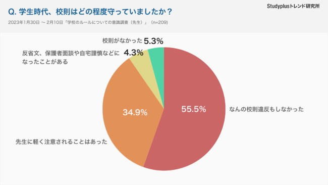 ・学生時代、校則はどの程度守っていましたか? ※先生209名が回答
