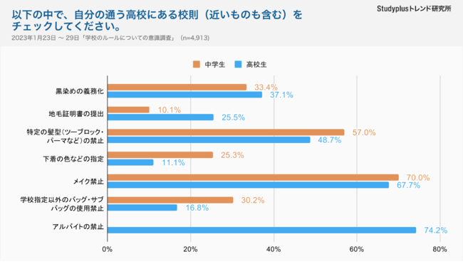 ・以下の中で、自分の高校にある校則(近いものも含む)をチェックしてください。 ※中高生4,913名が任意回答