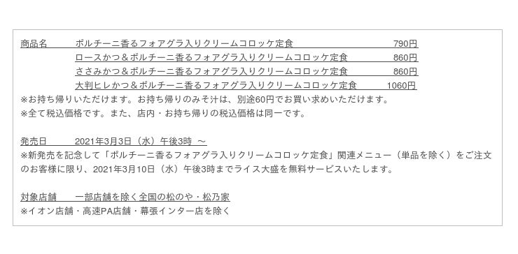 株式会社松屋フーズ(本社:東京都武蔵野市、代表取締役社長:瓦葺 一利)では、とんかつ専門店の「松のや・松乃家」におきまして、2021月3月3日(水)午後3時より「ポルチーニ香るフォアグラ入りクリームコロッケ」を発売いたします。