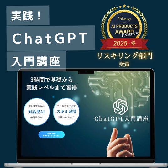 「AIsmiley AI PRODUCTS AWARD 2025 Winter」リスキリング部門受賞『実践!ChatGPT入門講座』3時間のオンライン講座で、それぞれのサービスについて基礎から実践まで実務的なケーススタディに沿って学べます。実際にプロンプトを入力するハンズオン形式で、講師から個別にフィードバックを受けながら、着実に理解を深めることができます。