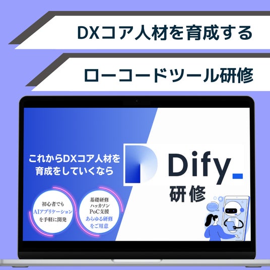 これからDXコア人材を育てようとしている企業にオススメ!『Dify研修』Difyは、誰でも直感的にAIアプリを開発できるノーコードプラットフォームです。従来の開発に必要な技術力や時間を不要にし、初心者でも簡単にAIアプリを作成可能です。基礎からPoC支援までの段階別の研修を提供しています。