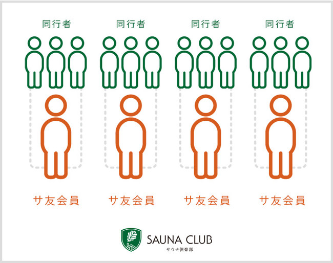 また、指名を受けたサ友会員は親会員が同行しない場合でも1度の予約で3名まで別のサウナ友達を連れて利用することができます。