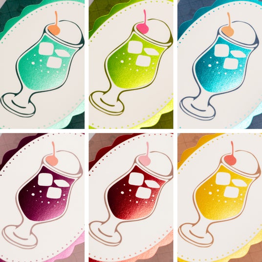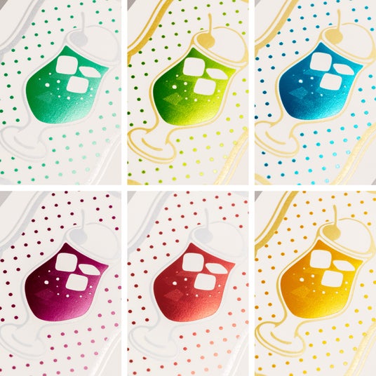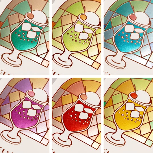 箔押しとは、金属の版を用い、熱と圧力で箔を紙などに転写する技法です。版に細かな模様を彫刻することで、額縁の柄やソーダの氷、さくらんぼなどのモチーフに、立体感を加え、色の違いを表現しています。