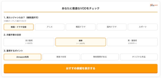 本機能は、見たいジャンル・月額予算・こだわりポイントの3問に答えるだけで、ユーザー一人ひとりに最適な動画配信サービスを即時に提案する、登録不要・完全無料のインタラクティブ診断ウィジェットです。