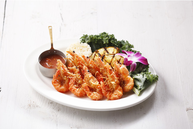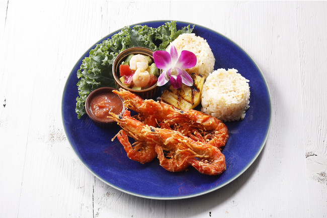 柔らかく殻ごと食べられる「ソフトシェルシュリンプ」を使ったハワイの名物料理にグリルパイン、ガーリックライスを添えました。香ばしい海老の旨みとガーリックの風味が楽しめます。