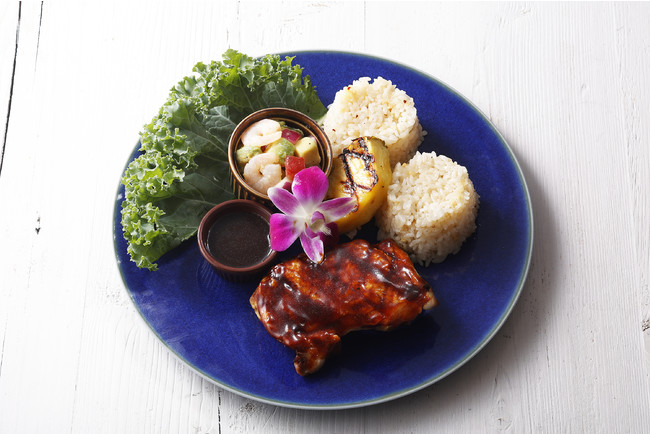 じっくり焼き上げたチキンをテリヤキ ソースで仕上げた一品です。ガー リックライス、グリルパイン、ロミロミ シュリンプとご一緒にお楽しみください。