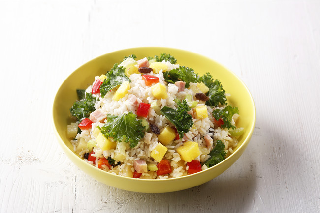 カルローズ米に、パイナップル、ケール、パプリカなどの彩り野菜を加え、ビネガー風味でライトに仕上げたトロピカルなライスサラダです。※お米は米国産カルローズ米を使用しています。
