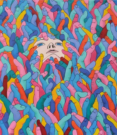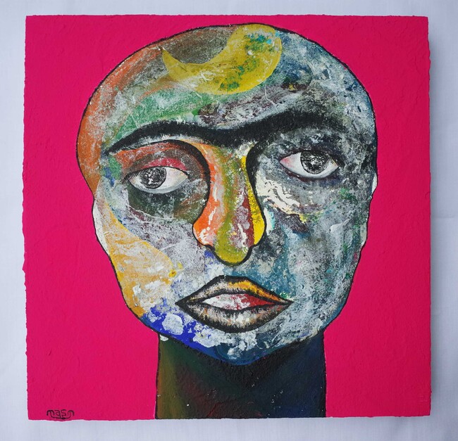 夥しい数の指の中に埋もれる凛々しい表情をした女性と思しき顔、硬質な筆触による先住民族のフェイスペインティングを想起させる肖像画、ダイナミックな形象と鮮やかな色彩対比で描かれた抽象画etc.バラエティに富んだイメージを展開する画家、岩川真澄。