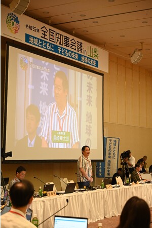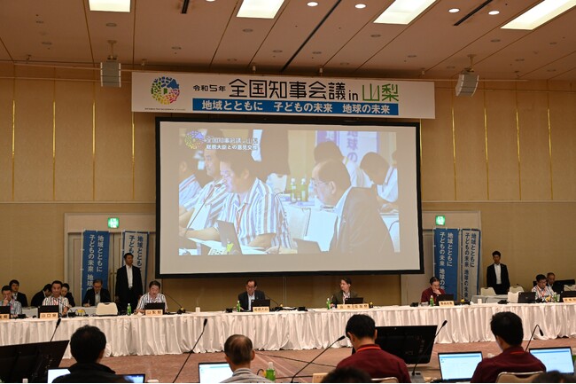 山梨県から7月25日(火)~26日(水) の2日間にわたり、全国知事会議を開催したことをご報告いたします。今回の会議は、45名の知事が出席しました。会議の概要及び長崎知事の主な発言等は次のとおりです。