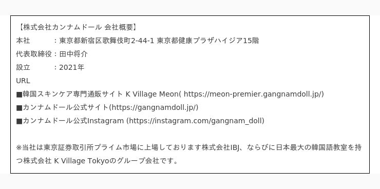 カンナムドールが運営する、韓国スキンケア専門通販サイト「K Village Meon」は、韓国語の美容:miyong から来ている言葉で、綺麗になるための美のスイッチをONにし、多くの方々に「美しく輝いてほしい」という意味が込められています。