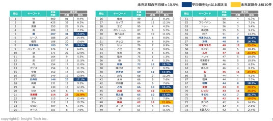 抽出条件1.のキーワードランキングをベースに、テキスト解析機能を使って抽出したキーワードの件数ランキングと、それぞれの未充足件数の割合を確認。「麺」「冷凍食品」「お弁当」「冷凍庫」「容器」「大きさ」などが未充足割合平均値を5pt以上上回る結果となった。