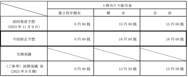 当社は、本日開催の取締役会において、以下のとおり、2023年11月9日に開示した2024年9月期(2023年10月1日~2024年9月30日)の配当予想を修正することといたしましたので、お知らせいたします。