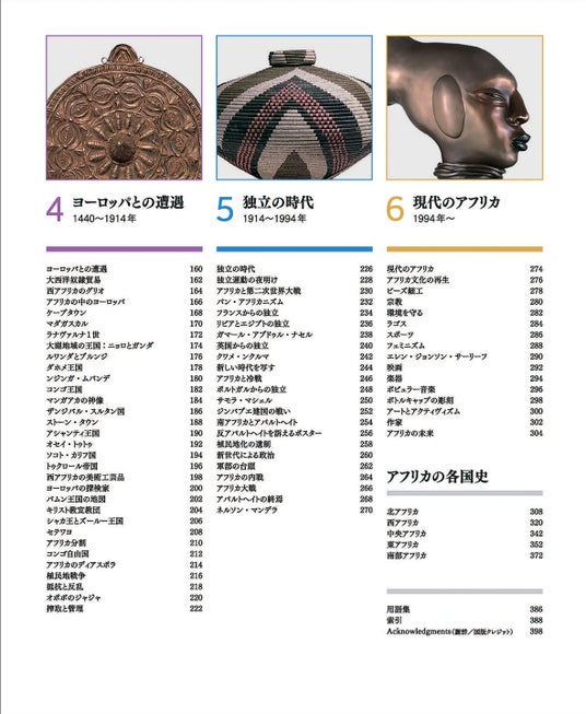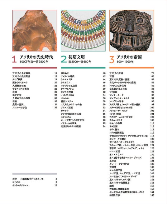 アフリカ大陸は人類発祥の地であり、現在は約3000の民族集団が約2000の言語を使用して生活している。その多様性の背景には数々の社会や国々の興亡の歴史がある。本書では、先史時代から文明の誕生、巨大帝国の時代、西洋による植民地化と独立闘争、そして現代のアフリカまでの流れを、多くの遺跡や遺物のみならず、衣装、工芸、美術、音楽、映画、文学など文化・芸術を取り上げながら紹介する。