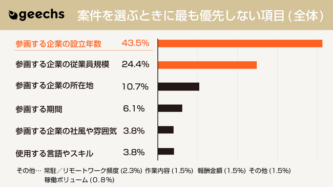 ITフリーランスが案件を選ぶ際に最も優先しない項目は、第1位が「参画する企業の設立年数」(43.5%)でした。次いで、「参画する企業の従業員規模」(24.4%)、「参画する企業の所在地」(10.7%)が続きました。案件検索サイトでは「スタートアップ」「設立〇年以上」など企業の設立年数に関する条件を選択できるようになっているケースが多く見受けられますが、ITフリーランスに関しては参画する企業の情報よりも案件の内容に着目して、これまでの経験が活かせるかどうかを重視して選んでいることが分かります。