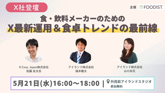約3万人の「フーディスト(R)(料理インフルエンサー/料理クリエイター)※」が参加する、日本最大級の料理インフルエンサープラットフォームサービス「フーディストサービス( https://foodist-service.jp/ ) 運営:アイランド株式会社」は、主催するマーケティングセミナーにてX Corp. Japan株式会社の佐藤友太さんをゲストに迎えし、「食・飲料メーカーのためのX最新運用&食卓トレンドの最前線」を5月21日(水)に開催いたします。
