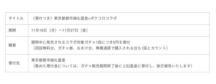 ココネが運営するアバター着せ替えアプリ『ポケコロ』には、お客様同士のコミュニケーション手段のひとつとして木への「水やり」があります。お互いに水やりをして木を育てあうという『ポケコロ』のコンセプトに合わせて、東京都都市緑化基金が後援する第18回日比谷ガーデニングショー2020が開催されるに際し、「寄付金つきコラボガチャ」をリリースし、期間内に『ポケコロ』内で販売するガチャ1回につき5円を寄付致します。