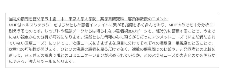 MHPのデータから、QOLの高い患者さんの特徴や、QOLとヘルスリテラシーの関係、治療満足度の高い患者さんの通院のきっかけ、薬剤ごとの治療満足度、疾患ごとに患者さんから必要とされるコミュニケーションなどを把握することができます。さらに、定期的にMHP構築調査を実施していくことにより、コホートとしてご利用いただけるデータベースの構築を目指しています。