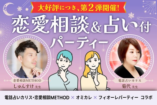 大手婚活総合会社の株式会社トータルマリアージュサポートが運営する「フィオーレパーティー」と、人気電話占い「Charis」を運営する株式会社ティファレト、婚活情報サイト「オミカレ」のコラボ企画第2弾!