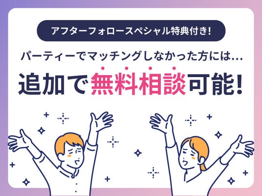 無料追加相談をプレゼント!パーティーでマッチングしなかった方は、パーティー終了後にさらに追加で占い師や恋愛コンサルタントに相談できる無料特典をプレゼントいたします。アフターフォロー付きで、ご参加いただいた方を全力で応援するプログラムとなっております。