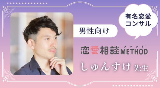 男性は、恋愛相談METHOD所属、男性専用の恋愛コンサルタントとして起業した経験があり、実践できるモテテクニック・モテるためのノウハウを伝授する相談員のしゅんいち先生による個別恋愛相談があり、お悩み別にアドバイスをさせていただきます。