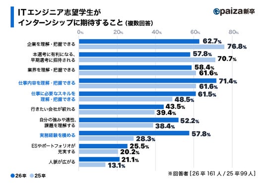 本選考に有利になることや早期選考に招待されることを重視する25卒の学生に対し、26卒の学生は、就業型インターンシップへの参加を希望する学生が多くなっています。