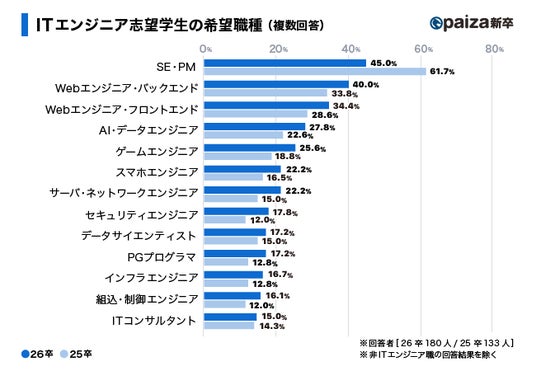 また、25卒と26卒を比較するとセキュリティエンジニアの人気が上がってきている結果となっております。昨今の情報漏洩事故の報道を受けてセキュリティエンジニアのニーズが高まっているという認知が学生の間にも広まってきている影響と推測されます。