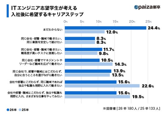 入社後のキャリアステップイメージについては、同じ会社で担当するタスクや職域がかわるイメージを持つ学生が一定数いる一方で、転職や独立をイメージしている学生も25卒は4割程度、26卒は3割程度いることがわかりました。