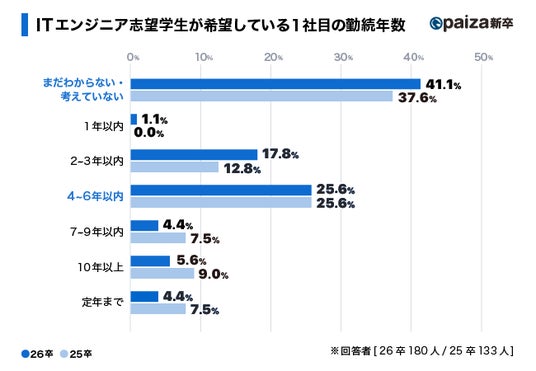 新卒で入社した企業に何年勤続したいか、という質問に対して、「まだわからない・考えていない」という回答が25卒は37.6%、26卒が41.1%と25卒、26卒共に約4割であった一方で