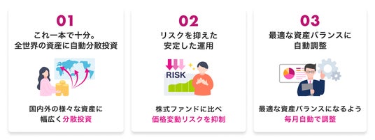 当ファンドは、投資初心者が抱きやすい「どんな商品を選べば良いかわからない」「価格の急変が不安」といったお悩みに寄り添い、毎月自動で資産バランスを調整し、全世界に分散投資ができる新商品です。自身で運用する商品の割合を細かに選択する必要がなく、毎月のバランス調整を当ファンド1本で任せることができるため、リスクを抑えながら安定的に資産を増やしていきたい方にもおすすめです。