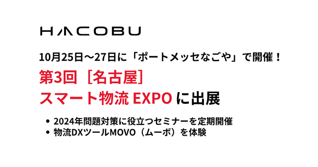 株式会社Hacobu(ハコブ、本社:東京都港区、代表取締役社長CEO 佐々木太郎、以下「Hacobu」)は、2023年10月25日(水)から27日(金)の3日間、ポートメッセなごやで開催される第3回[名古屋]スマート物流EXPOに出展します。