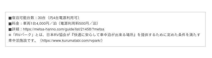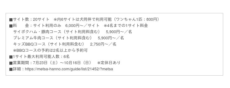 ■詳細:https://metsa-hanno.com/metsa/outdoors/