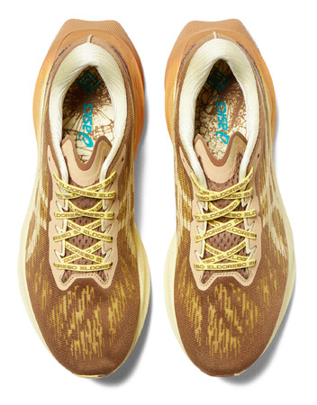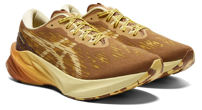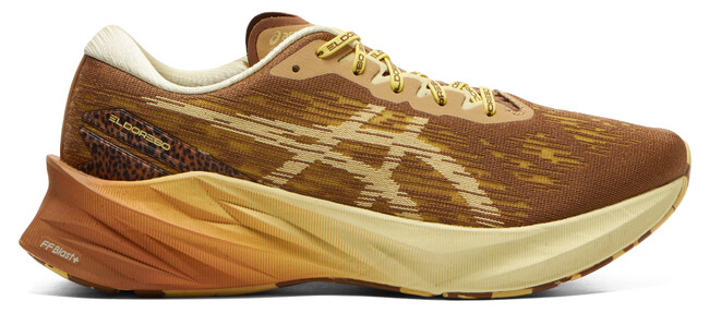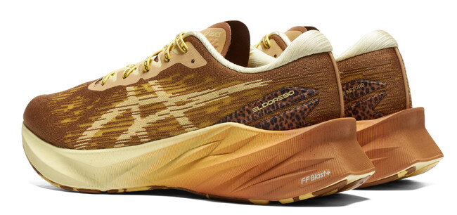 クッション性と反発性を兼ね備えたシューズ、「NOVABLAST 3(ノバブラスト3)」を展開します。「NOVABLAST 3」はボリューム感のあるデザインが特徴で、履いてすぐに軽さと優れた反発力が感じられるなど、爽快な走り心地を追求しています。本コラボレーションでは、全体をブラウンとイエローでまとめながら、アクセントとしてヒョウ柄をかかと部にあしらいました。また、ミッドソール(甲被と靴底の間の中間クッション材)にグラデーションを施すことで、スピード感や躍動感を表現しています。