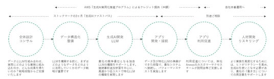これに伴い、本施策を開始し、企業特化の生成AIに必要な「データ構造化・継続追加事前学習・ファインチューニング・精度評価」のプロセスを3ヶ月の短期集中かつ低コストで提供しています。