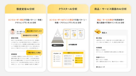 顧客(エンドユーザー)が投稿した口コミやレビュー、SNS、アンケートなどのデータから商品・サービス単位でデータを自動で分類・整理し、ユーザーの利用実態・購入動機・不満ポイントなどについてレポートを生成することができる機能です。