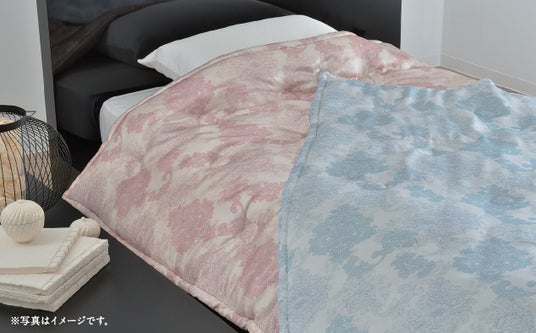 つるりとした肌触りが特長のシルクサテンを側生地に使用しました。詰めものは京都・丹後地方の職人が一枚ずつ丁寧に手引きした角真わたです。多くの層で空気を含み、吸湿性・かさ高性・ドレープ性に優れています。また、わた切れしにくく、わたぼこりが出にくいのも特長です。